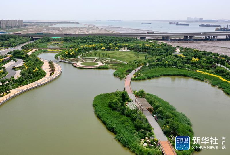↑这是6月8日拍摄的天津市滨海新区中新生态城南堤滨海步道公园一景(无人机照片)。新华社记者 李然 摄