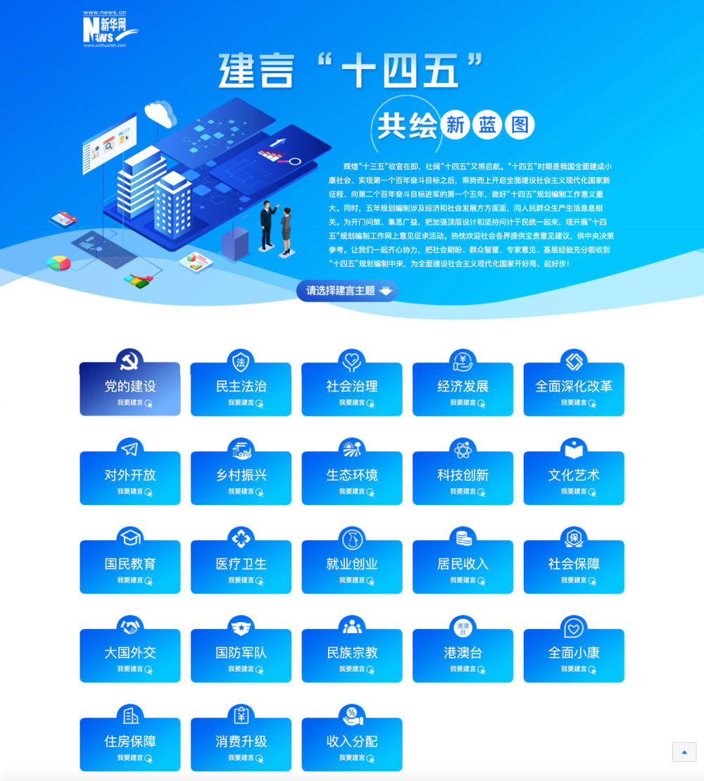 为了贯彻落实习近平总书记重要指示精神,今年8月中旬,人民日报、新华社、中央广播电视总台所属官网、新闻客户端及“学习强国”学习平台,同步推出了一个新专栏——建言“十四五”。