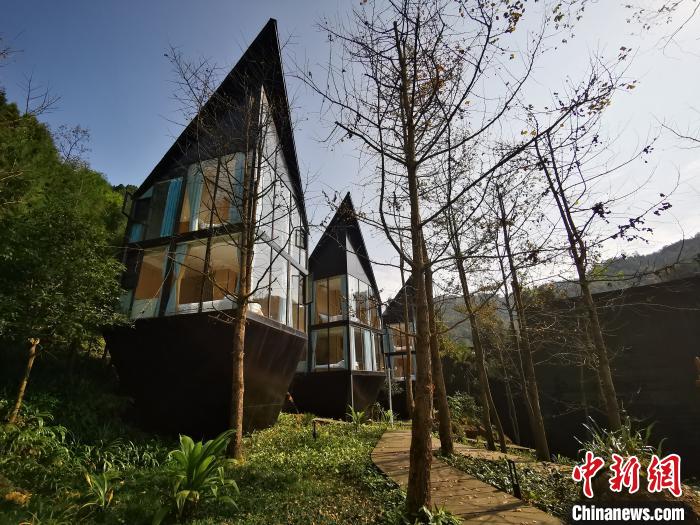 在四川绵阳安州区齐心村蝴蝶谷,21幢独栋民宿木屋散落于静谧的绿树丛林之间,背靠翠绿青山,门前流水潺潺。木屋深灰色的双坡屋顶、木色的墙面、巨大的落地窗以及宽敞的阳台,与自然风光相映成趣。“因为乡土情结挥之不去,我和爱人在2018年选择回乡创业。”“遇见·栖心”民宿负责人肖婷婷说。