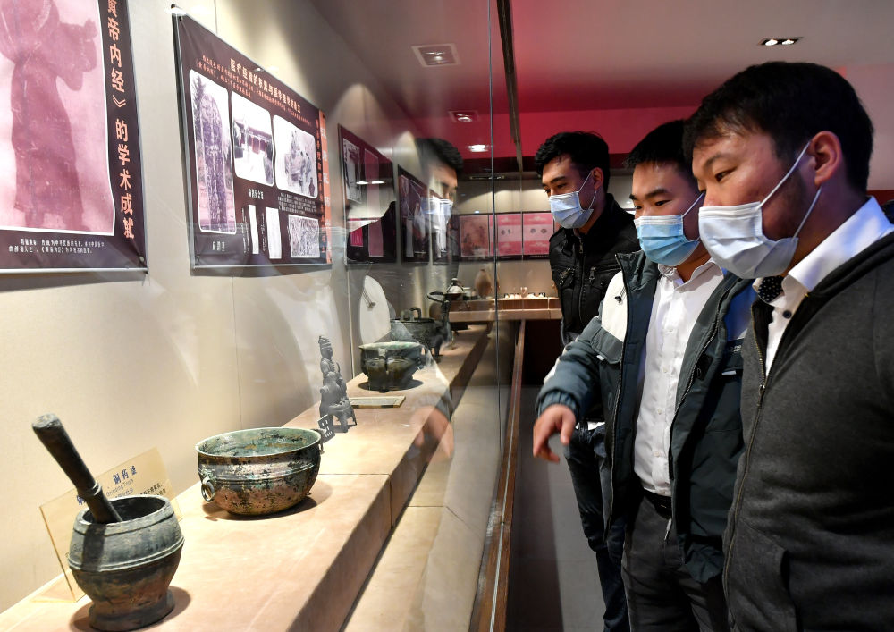 11月10日,陕西中医药大学来自哈萨克斯坦的留学生马文轩、何欢(右二)、李恩典(右一)在陕西中医药大学博物馆内参观。新华社记者 刘潇摄