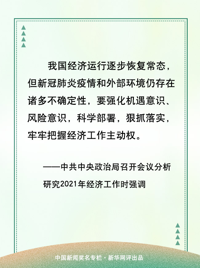 明年是我国“十四五”规划的开局之年,也是我国现代化建设进程中极其重要的一年,做好经济工作意义重大。“十三五”规划期间,我国经济实力、科技实力、综合国力和人民生活水平跃上新台阶,这为顺利实施“十四五”规划打下了良好的基础。但也要清醒认识到,当前新冠肺炎疫情防控不容松懈,外部环境不容乐观,只有强化机遇意识、风险意识,科学部署,狠抓落实,才能牢牢把握经济工作主动权。