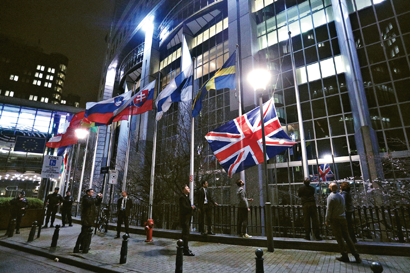 2020年1月31日,在比利时布鲁塞尔的欧洲议会外,工作人员降下英国国旗。布鲁塞尔当地时间1月31日24时(英国时间1月31日23时),英国正式脱离欧盟。 新华社记者 郑焕松/摄