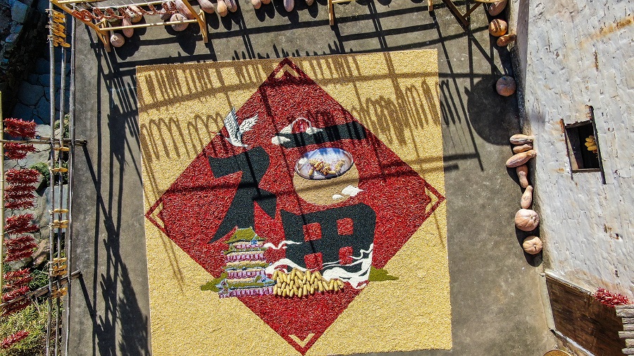 春节临近,江西省婺源县篁岭村,年味越来越浓。近日,晒秋大妈们用辣椒、玉米等农作物晒出“福”字造型,为游客送上新年的祝福。这个“福”字还融入了瓦罐汤、滕王阁等江西元素,十分富有创意。(王中庆)
