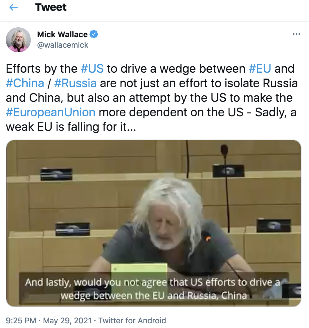 【环球网报道 记者 王心怡】“可悲的是,弱小的欧盟正在掉入(陷阱)......”当地时间5月29日,欧洲议会议员米克·华莱士在其官方推特账号上发布一段自己在议会发言视频。华莱士在发言时认为,美国在欧盟、中国和俄罗斯之间挑拨离间不仅仅是为了孤立中俄,也是试图让欧盟更加依赖美国,而欧盟正在掉入这个陷阱。