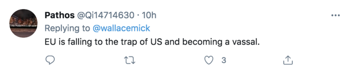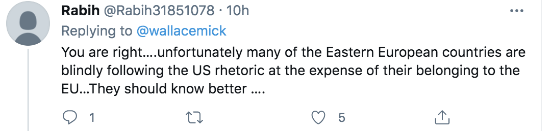 “你是对的…不幸的是,许多东欧国家盲目追随美国的言论,牺牲了自己的欧盟身份……他们应该更好地去了解….”