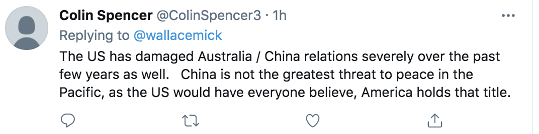 “在过去几年里,美国也严重损害了澳大利亚和中国的关系。中国才不是对太平洋地区和平的最大威胁,正如美国希望所有人相信的那样,美国才是拥有这一头衔的国家。”