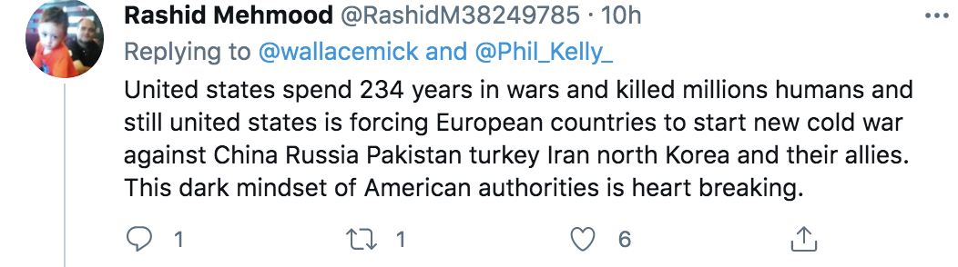 “美国花了234年的时间在战争中,杀死了数百万人,并且美国仍然迫使欧洲国家对中国、俄罗斯、巴基斯坦、土耳其、伊朗、朝鲜和他们的盟友发动新冷战。美国这种阴暗心态令人心碎。”