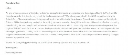 “我也许天真了,没想到这封信会被用来推广实验室起源假说,”比约克曼写道,“回顾这封信的措辞,我现在认为我本应预料到这样的后果。我本应更加积极主动——要么根本不签署这封信,要么要求修改更多措辞以表明我的立场。”