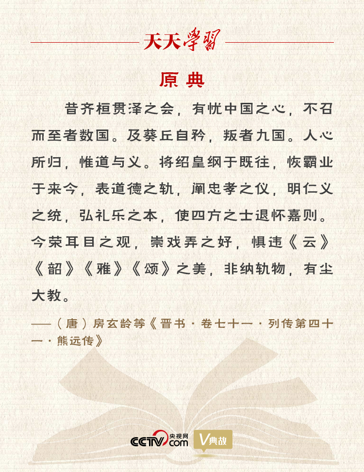 “人心所归,惟道与义”是东晋大臣熊远给晋元帝司马睿的谏言。他以春秋第一霸主齐桓公为例,早年齐桓公英明无比,心忧天下,各国共推其为盟主;而自葵丘会盟确立霸主地位后,齐桓公逐渐骄傲自满起来,原先归附的国家纷纷背叛。在熊远看来,人心所向、众望所归是立国之本,而要聚合民意、汇聚民心只有靠道德和仁义的力量,舍此之外别无他途。这对于刚刚成立的东晋王朝而言尤为重要。
