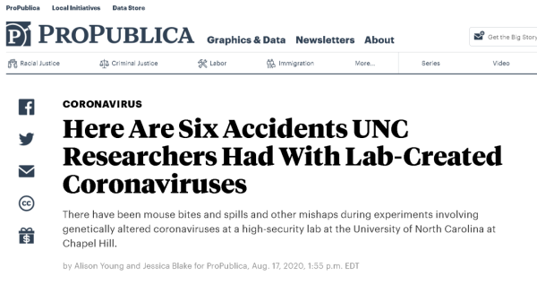 另据美国独立调查媒体“专业公众”网站去年8月报道,2015年1月1日至2020年6月1日,巴里克实验室所在的北卡罗来纳大学教堂山分校共向美国国家卫生研究院(NIH)报告了28起涉及转基因生物的实验室安全事故,其中6起涉及实验室制造的多种冠状病毒。
