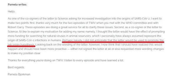 加州理工学院生物学教授帕梅拉·比约克曼就曾致信媒体澄清:自己参与在《科学》杂志上联署所谓“公开信”的本意是希望帮助募集更多资金,用于在动物宿主中寻找病毒,病毒溯源问题被政治化让她感到难过。