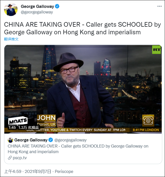 9月7日,英国前国会议员乔治加洛韦在推特和油管平台上发布视频,晒出了他在“今日俄罗斯”(RT)主持节目时,和一位来电观众的一段对话。