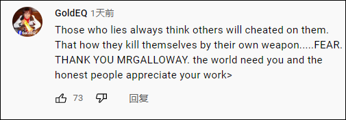 “撒谎的人总是觉得别人会骗他们……谢谢你,加洛韦先生,世界需要你,诚实的人会感谢你的工作。”