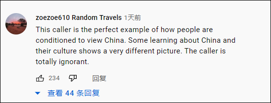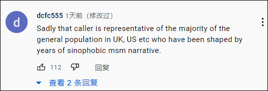 “可悲的是,这个来电观众代表了大多数的英美国家的普通民众,他们多年来深受‘排华主义’叙事的影响。”