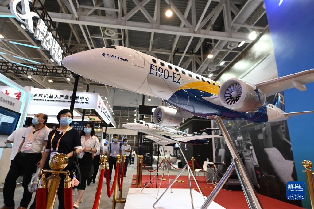 这是2021金砖国家新工业革命展巴西航空工业公司展位展出的飞机模型(9月8日摄)。新华社记者 林善传 摄