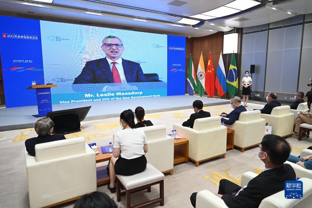 9月9日,金砖国家新开发银行副行长兼首席财务官马磊立在2021年金砖投融资论坛上通过视频发言。新华社记者 林善传 摄