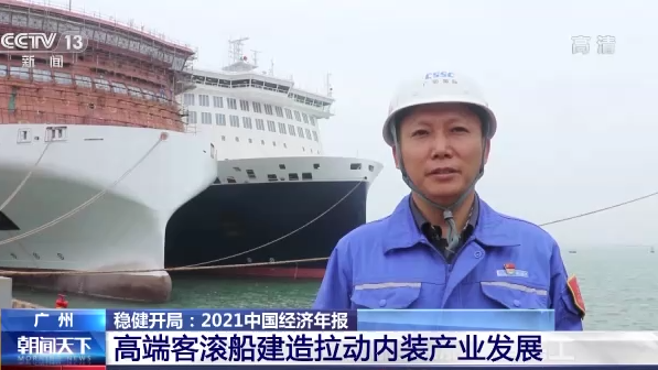 这里是中国船舶广船国际的造船码头,多艘大型豪华客滚船正在紧张调试和建造。负责人告诉记者,2021年,像这样的高端客滚船他们厂一共建造完工了5艘,产值占比达到约40%。