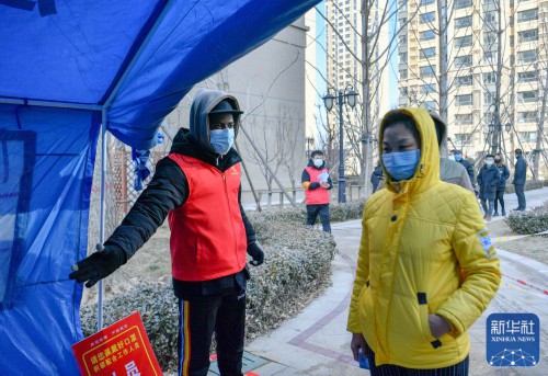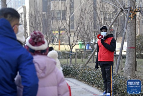 ↑在天津市东丽区东丽湖街道绿洲花园社区,万森在小区核酸采样点引导社区居民排队等待(1月15日摄)。