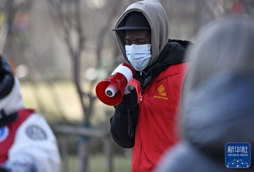 ↑在天津市东丽区东丽湖街道绿洲花园社区核酸检测点,万森用喇叭引导居民进行核酸检测(1月15日摄)。