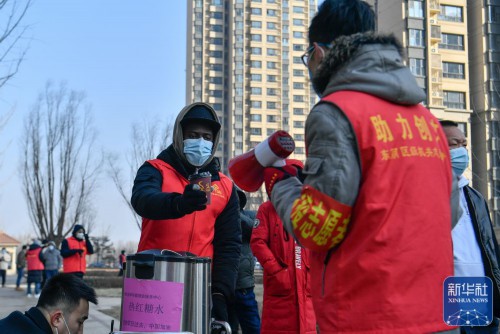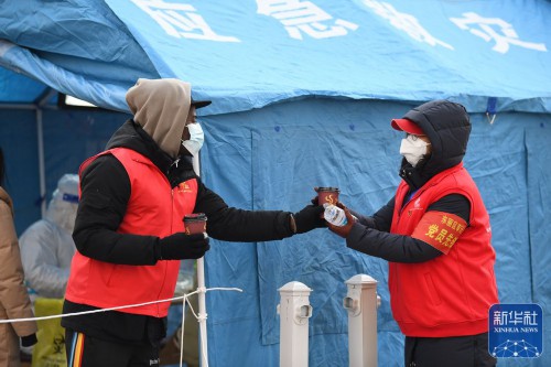 ↑在天津市东丽区东丽湖街道绿洲花园社区,万森为工作人员送上热红糖水驱寒(1月15日摄)。