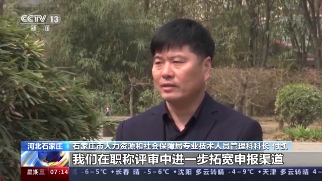 石家庄市人力资源和社会保障局专业技术人员管理科科长 付凯:我们在职称评审中,进一步拓宽申报渠道。对高校毕业生职称认定从原来一年一次的集中初聘认定,改为现在一月一次的考核认定,实现人才职称的即报即审,对稳定高校毕业生就业起到了保障作用,使得人才引得来,留得住。