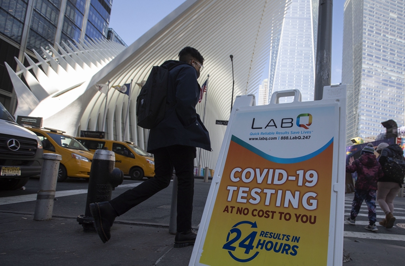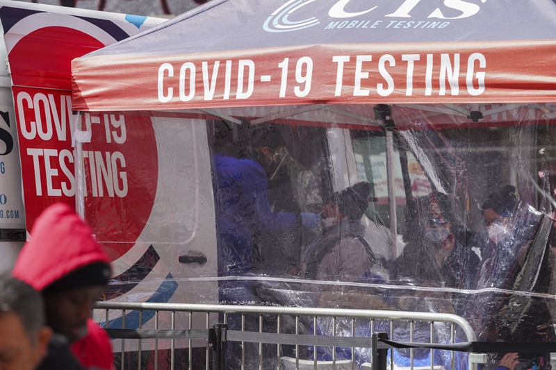 ↑3月29日,人们从美国纽约世贸中心车站外一个新冠病毒检测点旁走过。新华社记者 王迎 摄