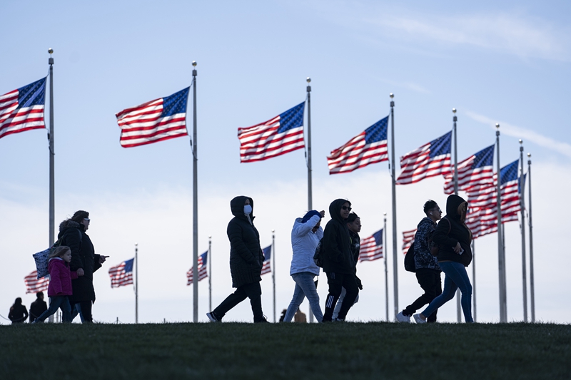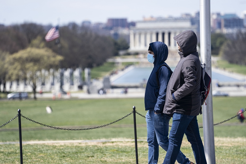 ↑3月29日,行人走在美国首都华盛顿的国家广场。新华社记者 刘杰 摄