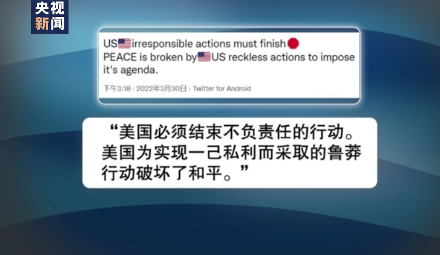 许多网友指责美国作为危机的幕后黑手,显然并不希望双方走向和平:“美国和北约不希望这场冲突结束。”“只要有利可图,美国就会让冲突持续下去。”“别再鼓吹长期战了。我们看透你(美国)了。”“你(美国)不是在帮助乌克兰。应该推动和平而不是破坏。(push for peace not for destruction)”“美国必须结束不负责任的行动。美国为实现一己私利而采取的鲁莽行动破坏了和平。”“美国想让冲突持续到乌克兰流尽最后一滴血。乌克兰人民何时才能意识到北约不是他们的朋友。欧盟何时才能意识到美国正迫使他们跟俄罗斯一样承受严厉经济制裁的后果。是时候对美国说不了!”