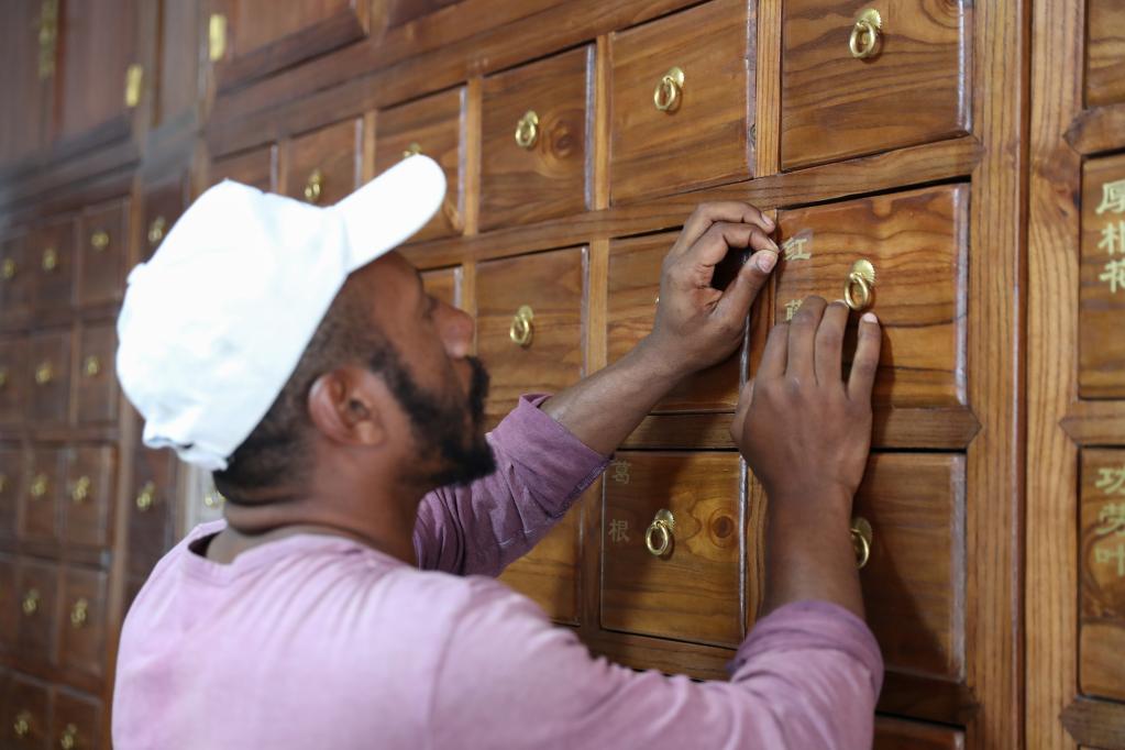 2018年11月11日,在巴布亚新几内亚莫尔兹比港中国(广东)-巴新疟疾防治中心,一位工作人员为防治中心的中药房药箱安装中文说明。新华社记者白雪飞摄