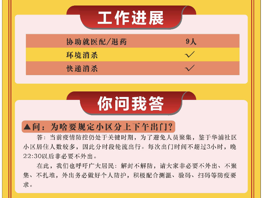 在这份抗疫日报上,从上到下,分为“重要资讯”栏目,更新每日上海发布的最新疫情消息;第二档是“华浦告示”,刊登当天小区的核酸检测或抗原自测情况,近日小区调整为防范区后还新增了每日发放通行证的通知;除了这两条固定栏目外,下面的栏目则更机动灵活,或刊登当日社区配药、就医、消杀、复工等服务信息;或介绍社区团购信息、或分享社区志愿者守望相助的暖心故事……记者注意到,在昨天(2日)的抗疫日报中,还在“你问我答”栏目上,向居民解释小区通行证为啥要分上下午错峰出门。