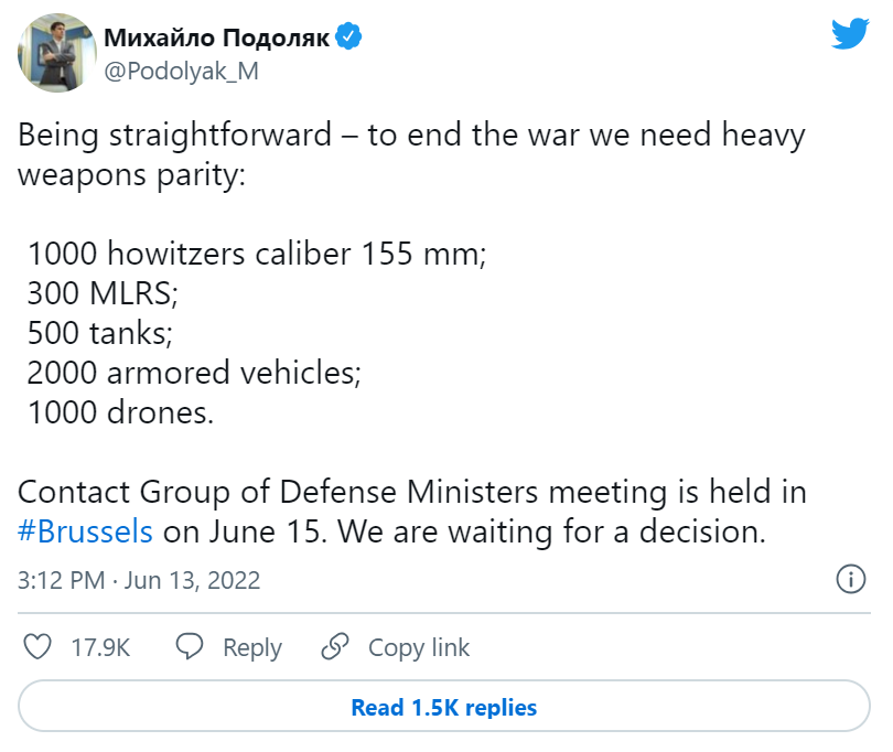 乌克兰总统办公室主任顾问波多利亚克近日在社交媒体上公布了一份武器装备的“愿望清单”,其中包括1000门155毫米榴弹炮、300套多管火箭炮系统、500辆坦克、2000辆装甲车以及1000架无人机。