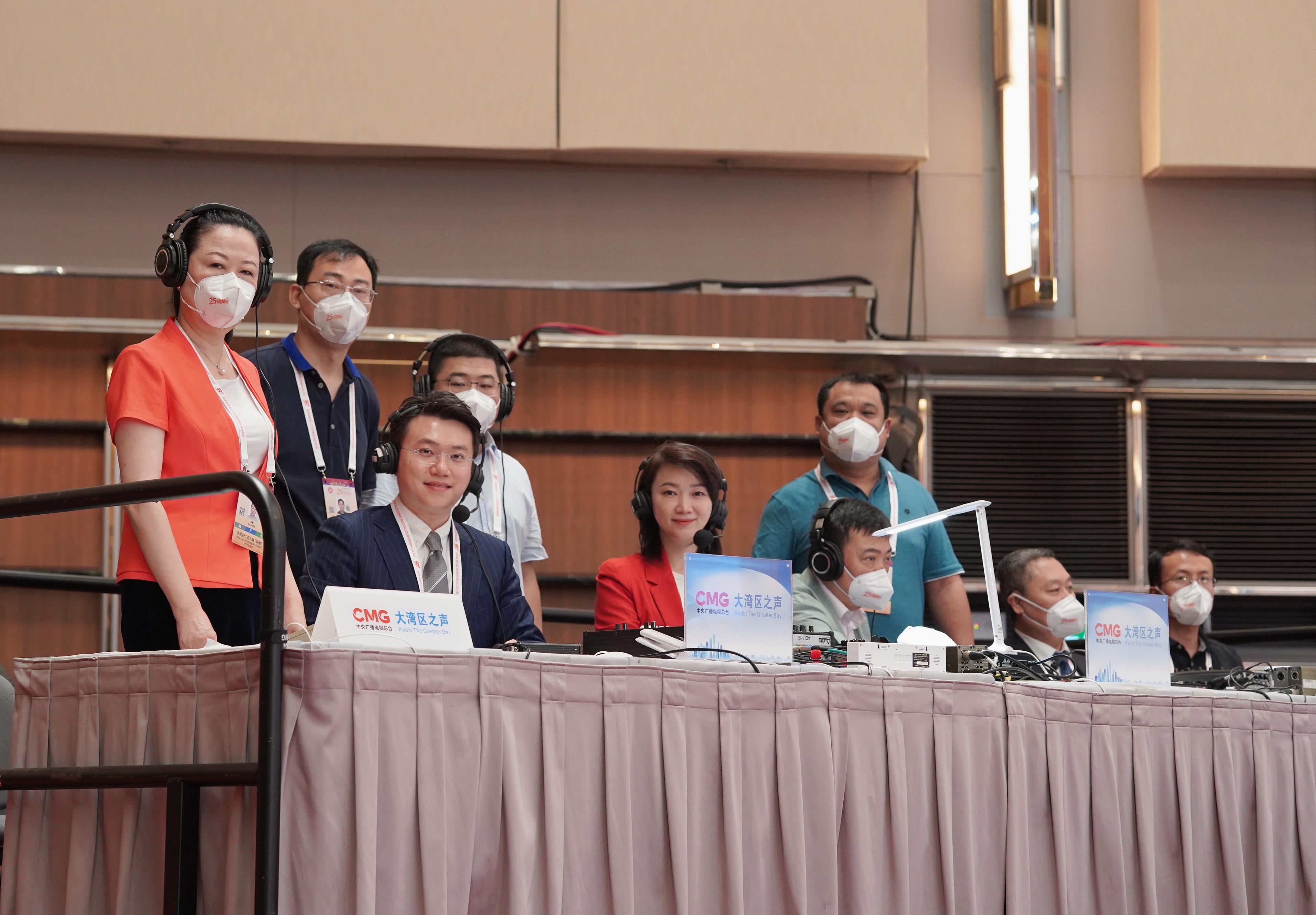 △总台大湾区之声7月1日在香港会展中心直播,大湾区之声也是唯一在现场享有专门工作区域并现场播报的媒体