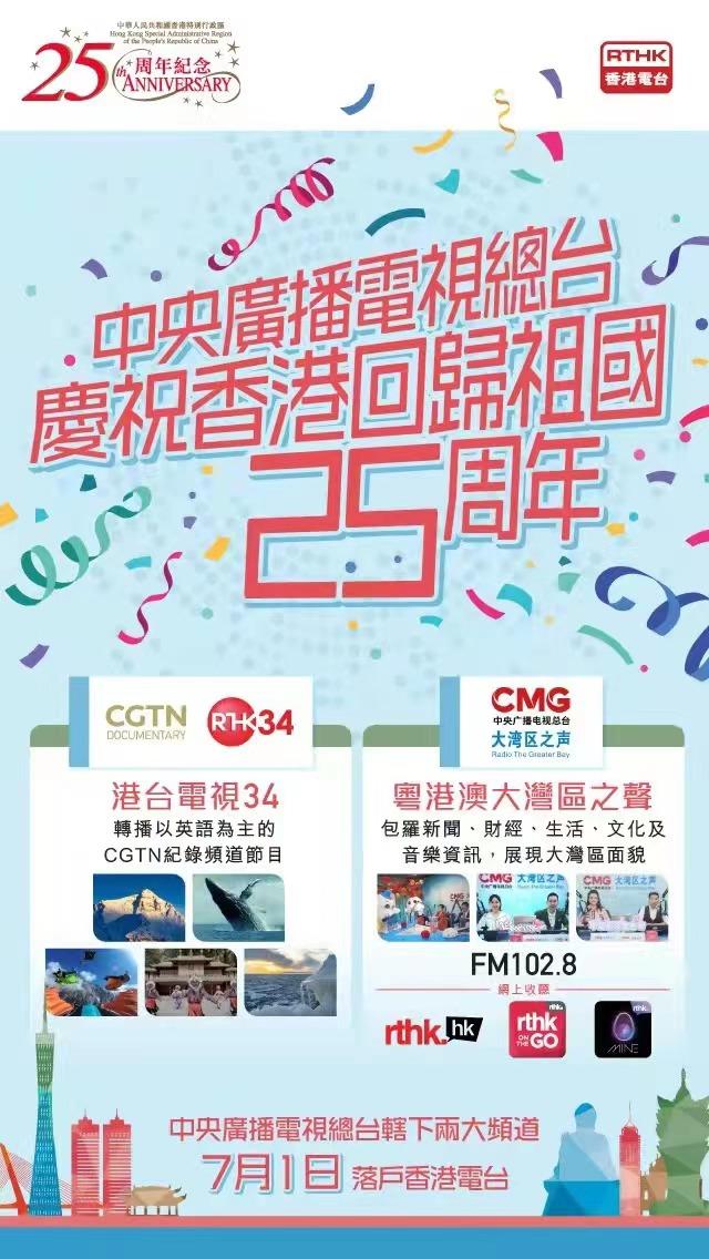 CGTN纪录频道通过香港电台数字地面电视公共平台(香港电台电视34频道)播出,覆盖香港地区99%的人口,超过730万人。粤港澳大湾区之声通过FM102.8频率在香港地区播出,可覆盖约20%的人口,约148万人。同时,香港电台官方网站及客户端等新媒体平台实现同步播出。