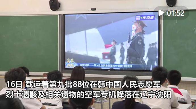 16日中午,载运着第九批88位在韩中国人民志愿军烈士遗骸及相关遗物的空军专机降落在辽宁沈阳。香港培侨中学当天组织收看这场别具意义的现场直播。