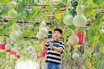 8月15日,甘肃陇南市成县陈院镇白马寺村,青年农民尚育康网上直播葫芦瓜生长,宣传特色家庭农场。李旭春摄(人民图片)