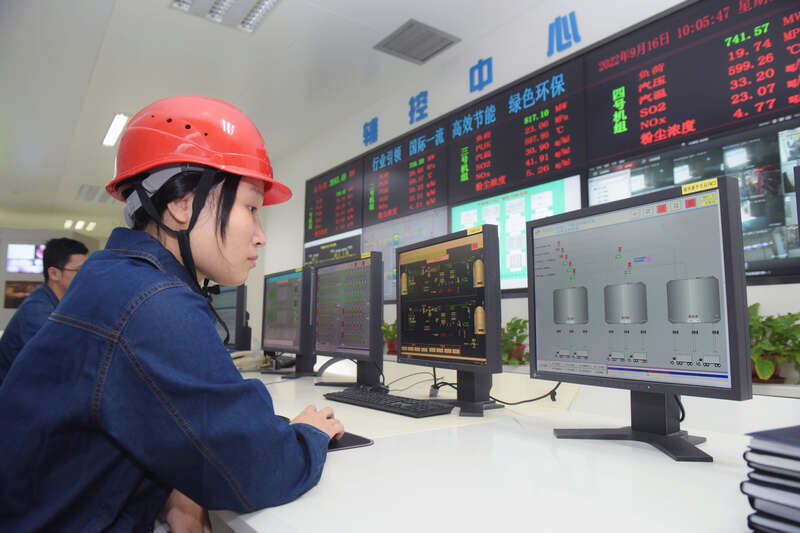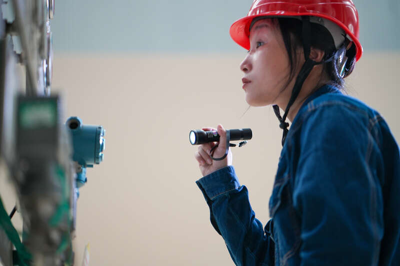 别看已经入秋,但华能海门电厂车间里的温度近 42 ℃,伴随着机器的轰鸣声,纪洁虹手握一个黑色手电筒,挨个机器认真巡查,顾不上抬手抹掉额角的汗。