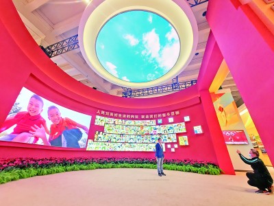 观众在“奋进新时代”主题成就展中央展区由302张照片组成的笑脸墙前拍照留念。光明日报记者闫汇芳摄/光明图片