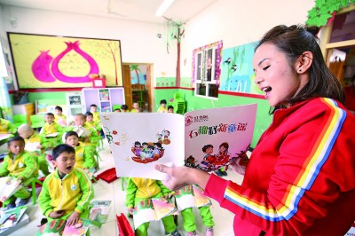 新疆维吾尔自治区吐鲁番市高昌区幼儿园的孩子们在学习《石榴籽新童谣》。“奋进新时代”主题成就展图片