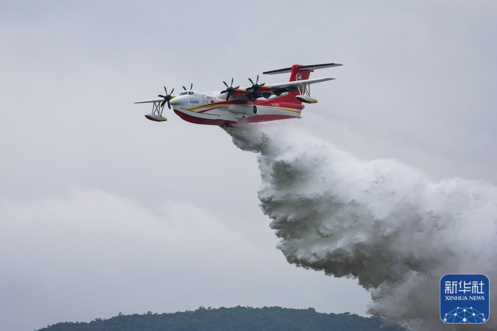 AG600M全状态新构型灭火机在第十四届中国航展上进行投水演示(11月8日摄)。新华社记者 刘大伟 摄