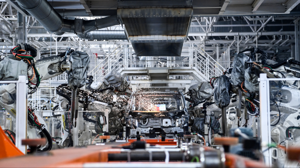 2022年10月17日,在吉林长春中国第一汽车集团有限公司红旗繁荣工厂焊装车间内,焊装机器人在生产线上焊接车身。 中国各行各业正加快实现高水平科技自立自强。(新华社)