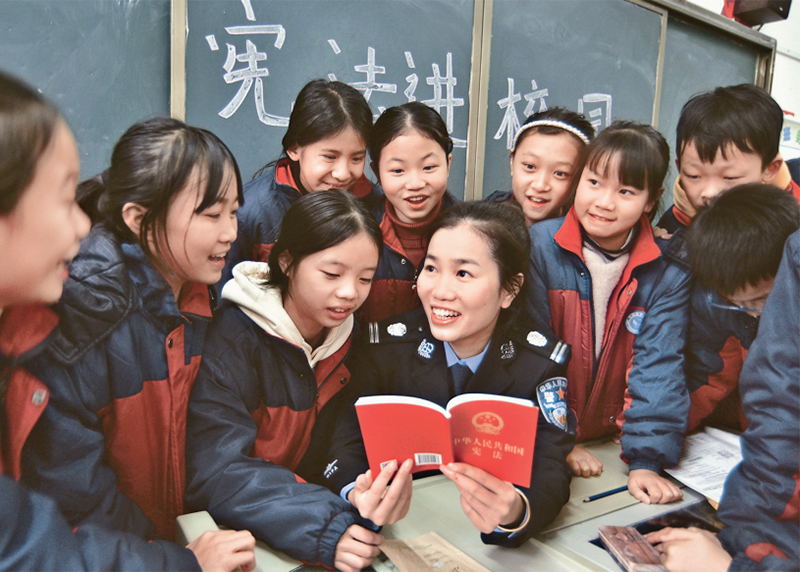 在习近平法治思想指引下,新时代十年我们党全面加强宪法实施和监督,设立了全国人大宪法和法律委员会,建立宪法宣誓制度,设立国家宪法日。图为2022年12月4日,第九个“国家宪法日”活动当天,湖南省郴州市嘉禾县司法局开展“宪法知识进校园”活动,司法工作人员在博雅学校向学生讲解宪法知识。人民图片供图
