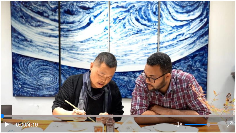 马赫迪·艾哈迈德(右一)在学习青花绘画。受访者供图