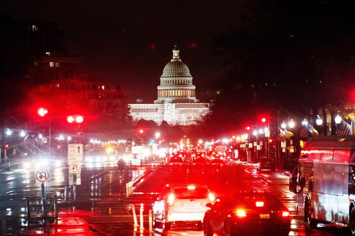2022年12月22日,美国华盛顿雨中的车辆和国会大厦。新华社记者 刘杰 摄