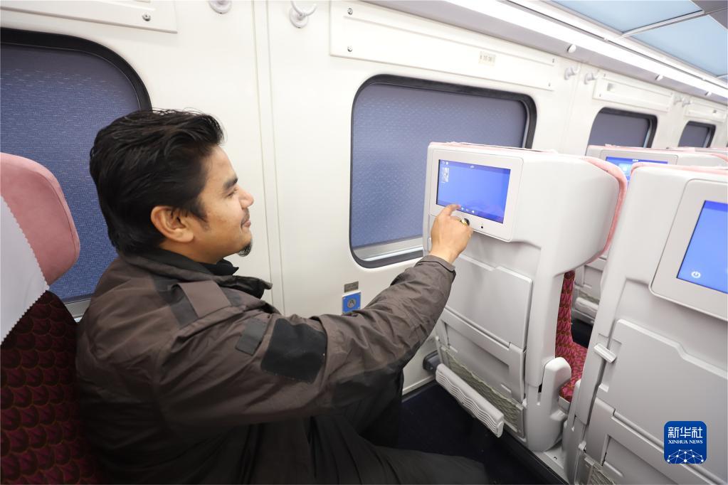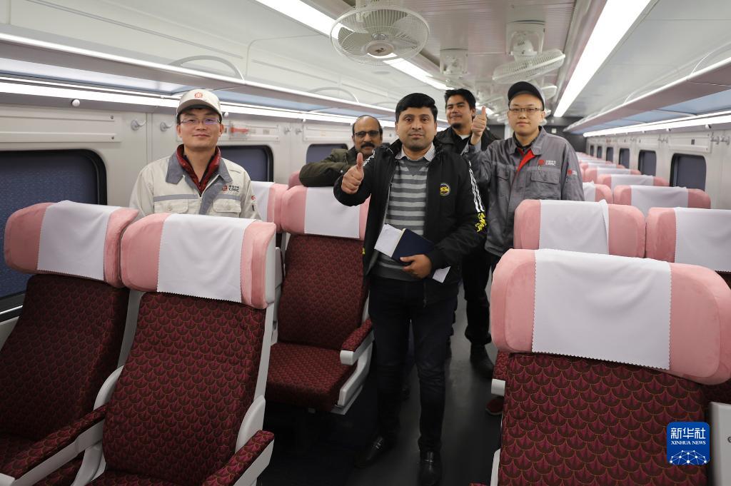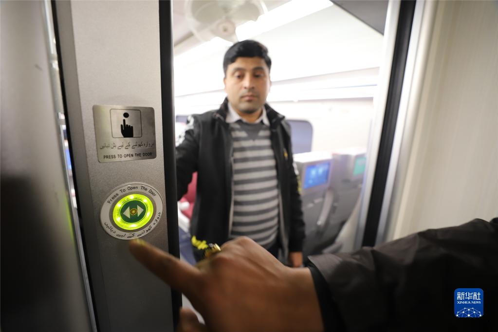 登上列车,中车唐山机车车辆有限公司(简称“中车唐山公司”)工程师雷松和巴基斯坦铁路公司拉合尔站车辆检修处主任伊姆兰·雅各布开始检查车厢控制室的各项设置参数,为不久后的客车试运行做准备。