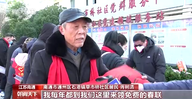 南通市通州区石港镇草市桥社区居民胥树清:我每年都到我们这儿来领免费的春联。这个手写的春联更有年味,更有传统。