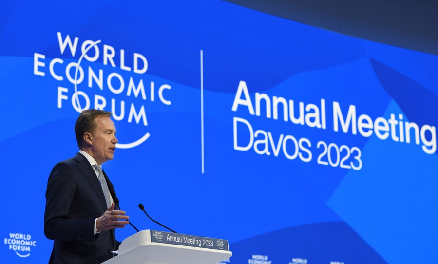 1月20日,在瑞士达沃斯,世界经济论坛总裁博尔格·布伦德在世界经济论坛2023年年会作闭幕致辞。(新华社记者连漪摄)