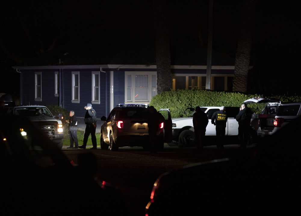 ↑1月23日,执法人员在半月湾市枪击事件现场调查。