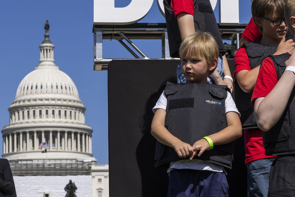 ↑2022年6月6日,学生们身穿防弹衣在华盛顿的国会大厦前参加名为“不要回避”的抗议活动,呼吁立法机构正视美国枪击案频发的社会问题,要求加强枪支管控立法。