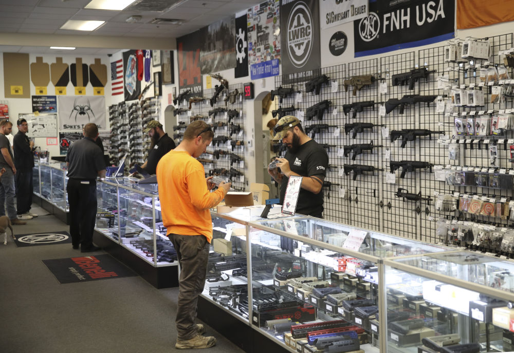 ↑2017年10月4日,拉斯维加斯的一家枪械商店内,枪支弹药、枪周边用品、枪文化衍生品等应有尽有。
