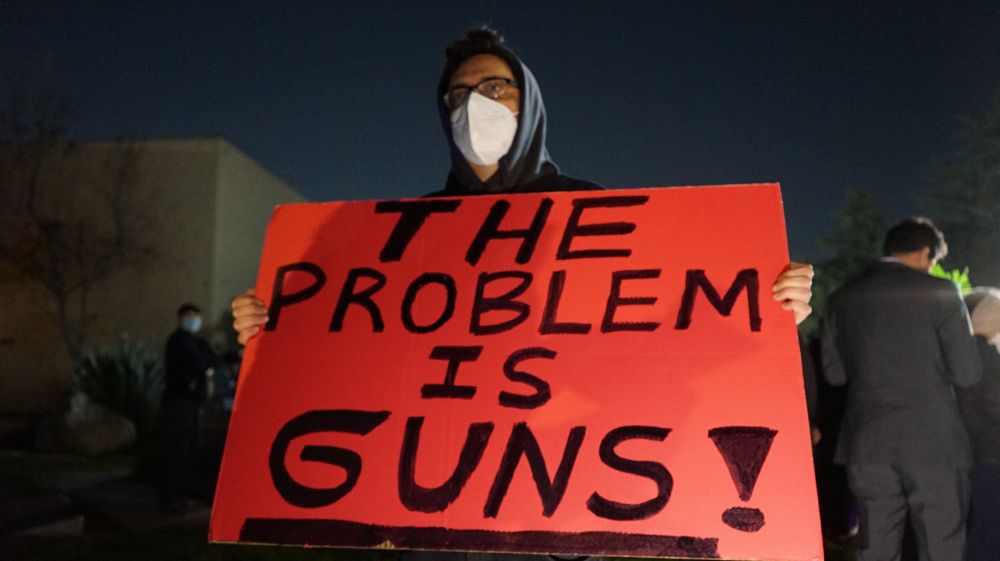 1月23日夜,美国加利福尼亚州蒙特雷帕克市政厅前,点点烛光摇曳,弥漫着哀伤和愤怒。一块写着“问题在于枪支”字样的红色标语牌格外醒目↓